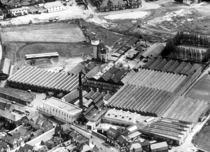 De textielfabrieken van Elias aan de Strijpsestraat met daarachter de bleekvelden. (Aviodrome 010437zr)