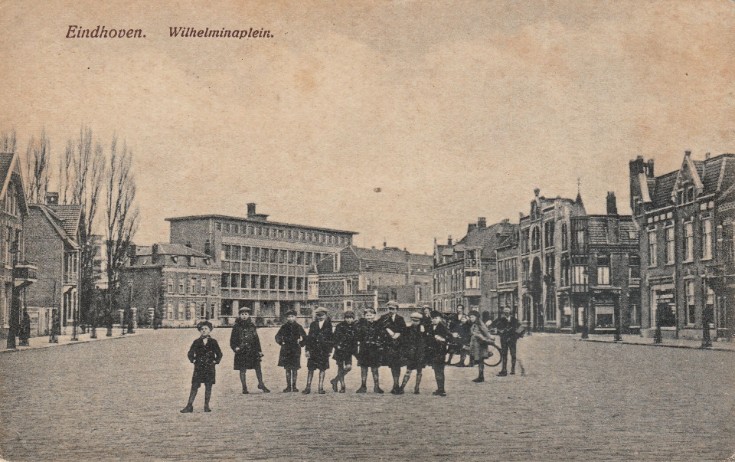 Het Wilhelminaplein is nog onverhard en behoorlijk leeg. We schatten dat de foto in de jaren twintig of dertig is gemaakt. Aan de overzijde van de WIllemstraat zien we het gebouw van de P [meer]