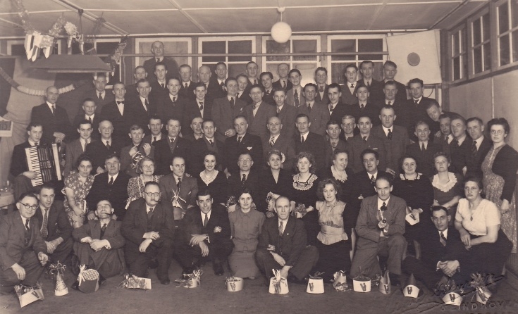 Uit de schoenendoos van mijn vader. Het lijkt mij een feest bij Picus, zie het Picus logo op de feestmutsen. Mijn vader staat op de achterste rij, de 2e van rechts. Wat hij daar doet is mij een raadse [meer]