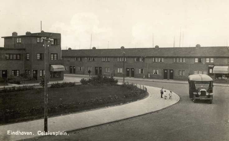 Het Celsiusplein in Woensel anno jaren dertig van de 20e eeuw. Rond het Celsiusplein realiseerde de woningbouwvereniging Volkshuisvesting de eerste fase van 367 "gemeentewoningen aan het Lij [meer]