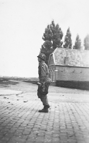 Dit is een foto van de eerste bevrijder die wij zagen op de Kloosterdreef. De foto is genomen uit het kelderraampje van de fam. de Kuster. De pad op de achtergrond is de zandpad die naar de velden in [meer]
