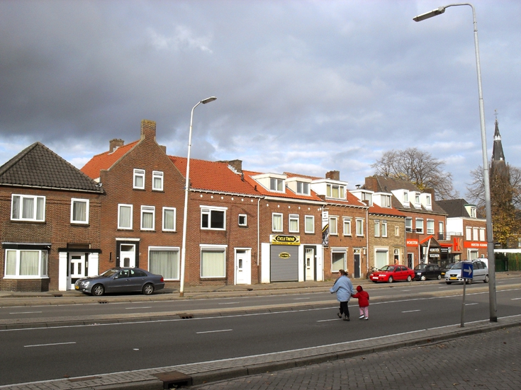 Een blik in de Kronehoefstraat met de Boschdijk in de rug. In de verte de toren van de St. Petruskerk.