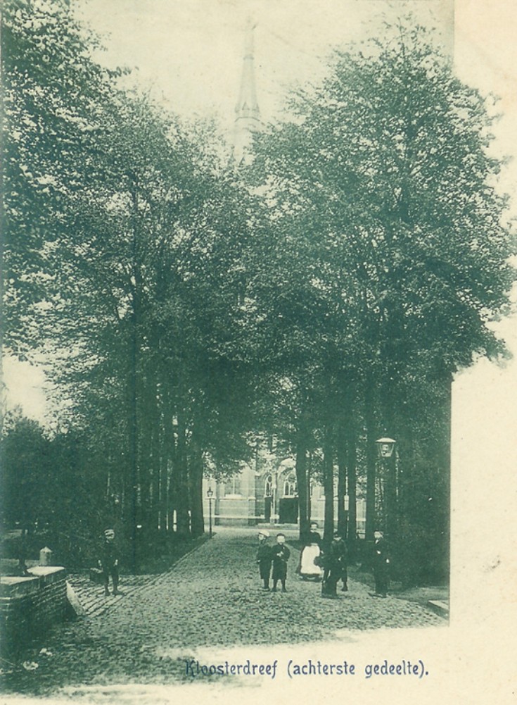 Toen nog Kloosterdreef. Links staat het gebouw van de Vincentiusvereniging. Van september 1917 tot januari 1919 is het St. Joriscollege met 4 klassen gestart in het vergadergebouw van deze vereniging. [meer]