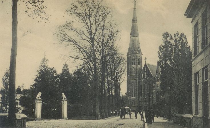 De Kloosterdreef (vanaf 1920 Ten Hagestraat) in 1908. Nog met handkarren en links de gracht. De Kerk is toegewijd aan het Heilig Hart en is gebouwd in 1898 naar ontwerp van de architecten P.J.Bekkers [meer]