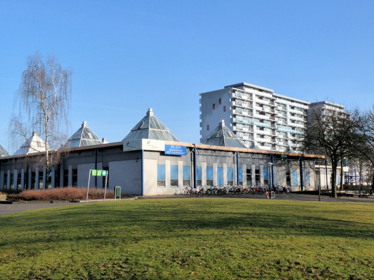 Wijkgebouw 't Karregat met daarachter de hoge galerijflat aan de Urkhovenseweg. De foto is genomen vanaf de Broekakkerseweg.