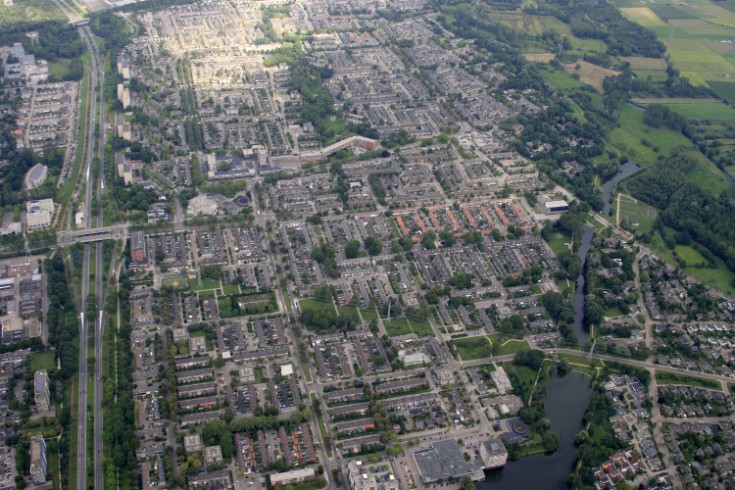 Een luchtfoto vanuit het noorden genomen van de wijk Eckart. Even ter oriëntatie: Links op de foto van boven naar onder de Kosmoslaan met rechts daarvan in het midden de sporthal Eckart. Vandaar [meer]